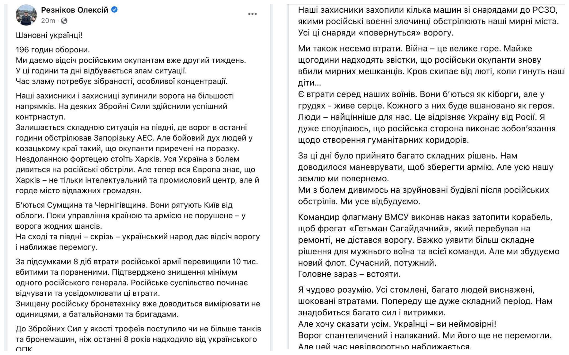 09:08 Министр обороны Резников подвёл свои итоги первых 7 дней войны.