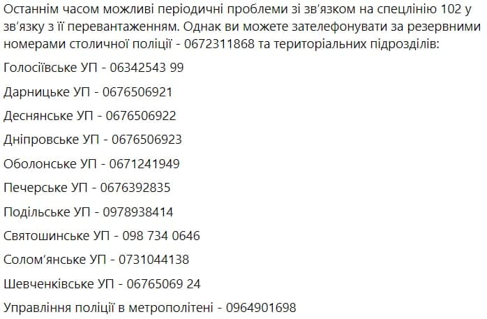 07:02 Киевская полиция публикует дополнительные номера по столичным райотделам из-за перегруженности линии 102.