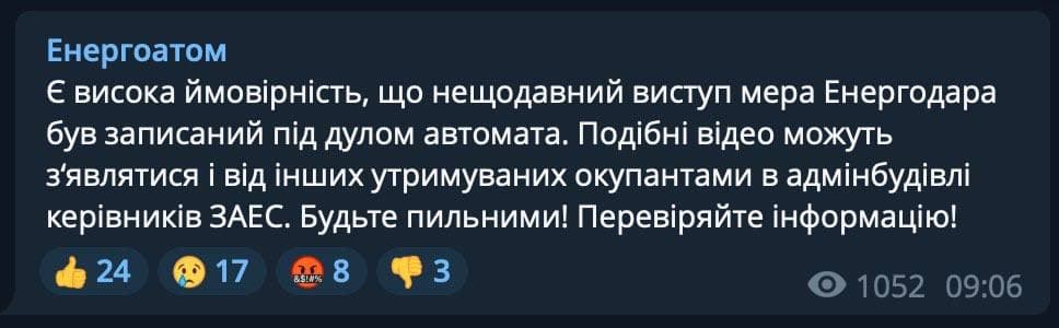 09:42 Российские военные просили руководство Энергодара ненадолго впустить их в город, чтобы сделать фото на фоне Запорожской атомной электростанции для отчета