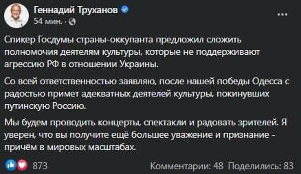 10:52 Мэр Одессы Геннадий Труханов записал видео с одним вопросом на фоне детского дома. "Люди боятся. Они пока не знают, что это война. Но они боятся. И у меня вопрос: от кого вы, бл@дь, нас спасаете?"