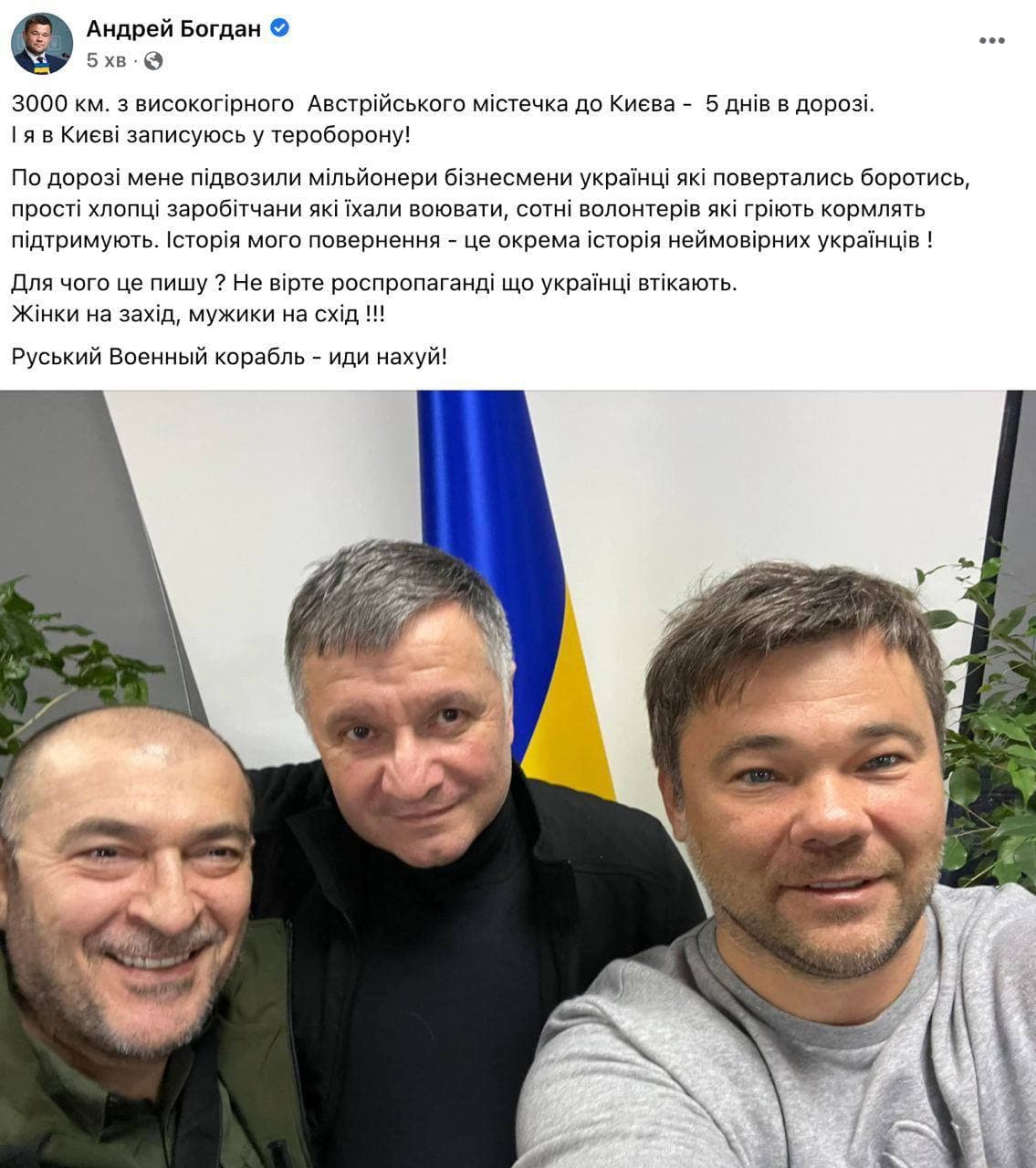 20:45 Экс-глава Офиса президента Андрей Богдан в комментарии "Стране" объяснил, почему на 8-й день войны вернулся из Австрии в Украину и вступил в ряды терообороны Киева.