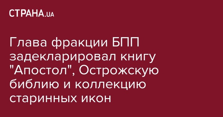 Председатель фракции "Блок Петра Порошенко" в Раде Игорь Грынив в своей электронной декларации указал экземпляры старинной книги "Апостол" Федорова, выпущенной во Львове в 1574 году, а также Острожской библии 1581 года выпуска.