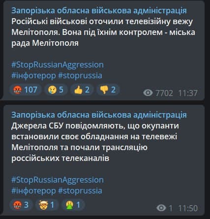 Запорожская областная военная администрация сообщает, что российская армия захватила телевизионную вышку в Мелитополе.