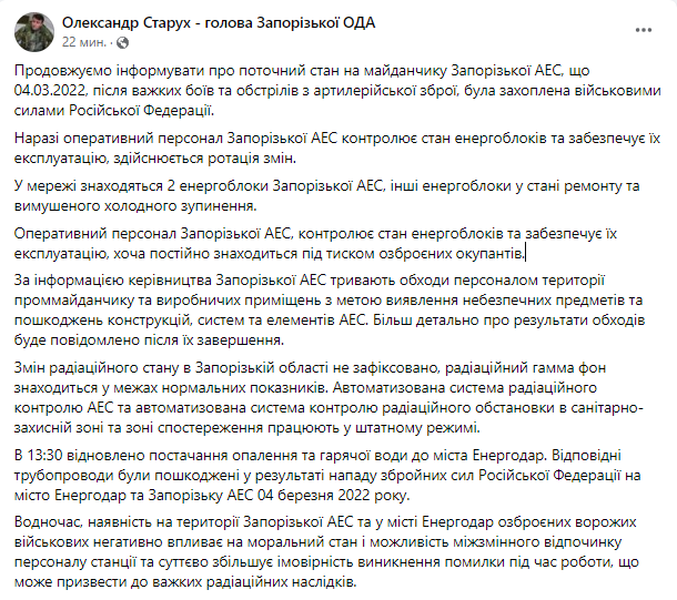 Как сообщил губернатор региона Александр Старух, наличие на территории Запорожской АЭС и в городе Энергодар вооруженных вражеских военных негативно влияет на моральное состояние и возможность межсменного отдыха персонала станции и существенно увеличивает вероятность возникновения ошибки во время работы. Все это может привести к тяжелым радиационным последствиям.