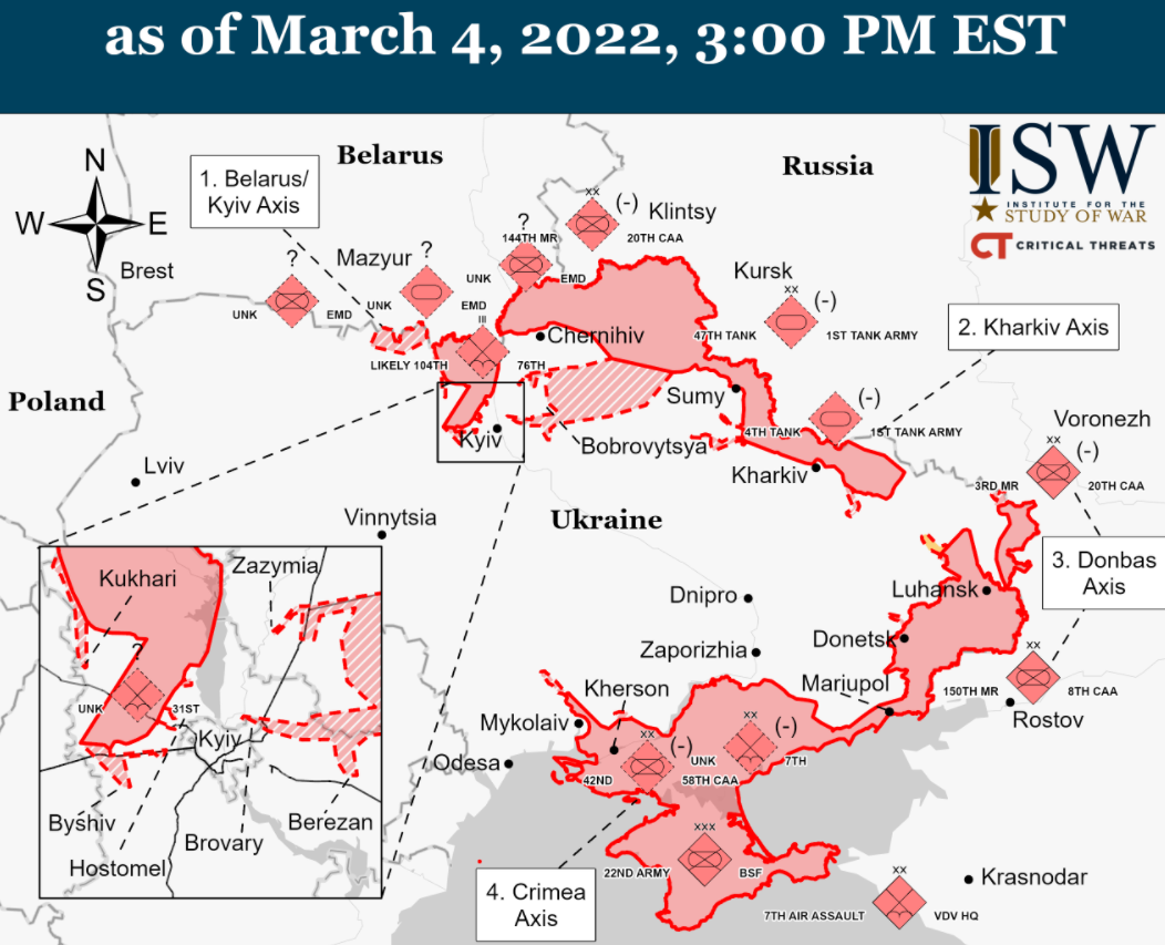 Институт изучения войны (США) опубликовал карту на 4 марта. По ней видно: