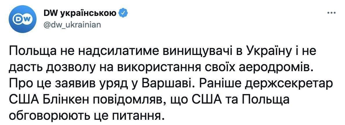 "Вероятно речь идёт об информации, что США обсуждают с Польшей поставки самолетов. Но окончательное решение, насколько можно понять из цитаты, ещё не принято", - комментирует Telegram канал "Политика Страны".