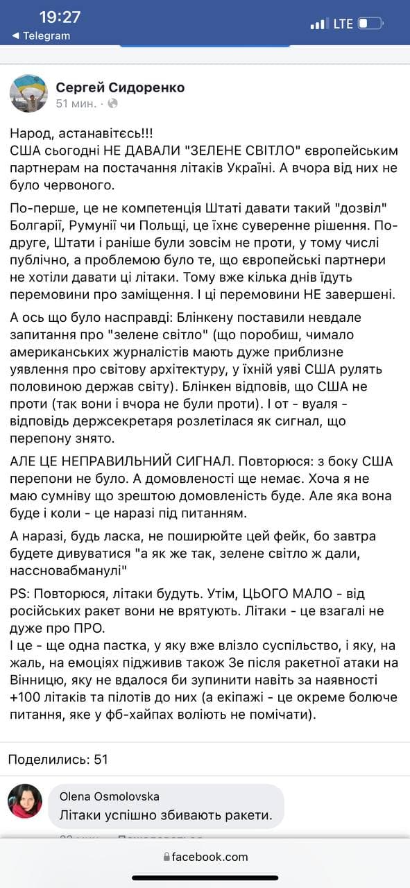 Позже появилась информация из Варшавы, из которой следовало, что с самолётами из Польши вышло все не так, как многие поняли из слов Блинкена про "зелёный свет" для поставок истребителей в Украину.