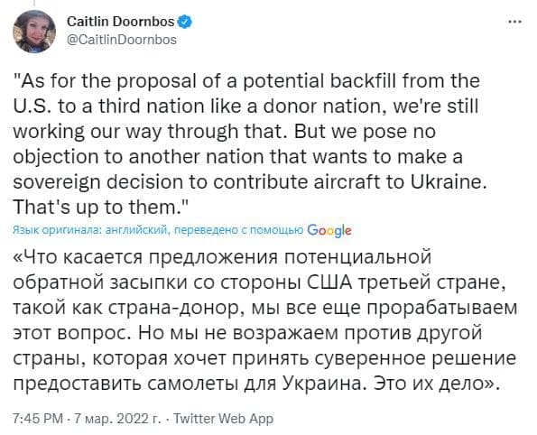 "Мы не будем стоять на пути, если такая страна, как Польша, захочет предоставить Украине самолеты. Это суверенное решение, которое они могут принять. [...] Что касается предложения о потенциальном восполнении со стороны США третьим странам [...], то мы все еще прорабатываем этот вопрос", - цитирует журналистка газеты Stars and Stripes Кейтлин Дорнбос слова представителя Пентагона на своей странице в Twitter.