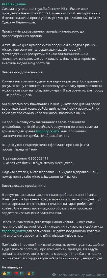 Глава УЗ Александр Камышин сообщил, что внутренняя безопасность "Укрзализници" задержала двоих проводников -  Равнистова и Пищанского на получении взяток от беженцев.