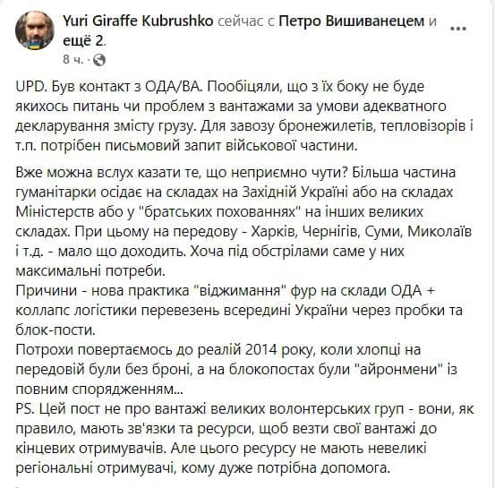 19.23 Известный волонтер говорит о проблеме с доставкой гуманитарной помощи на передовую - в Харьков, Чернигов, Николаев, Сумы.