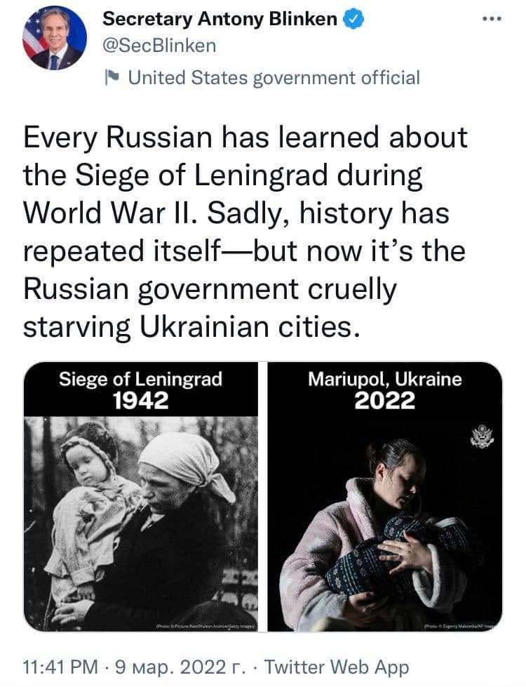 "Каждый россиянин знает о блокаде Ленинграда во время Великой Отечественной войны. К сожалению, история повторилась, но теперь российское правительство жестоко морит голодом украинские города", - написал Блинкен.