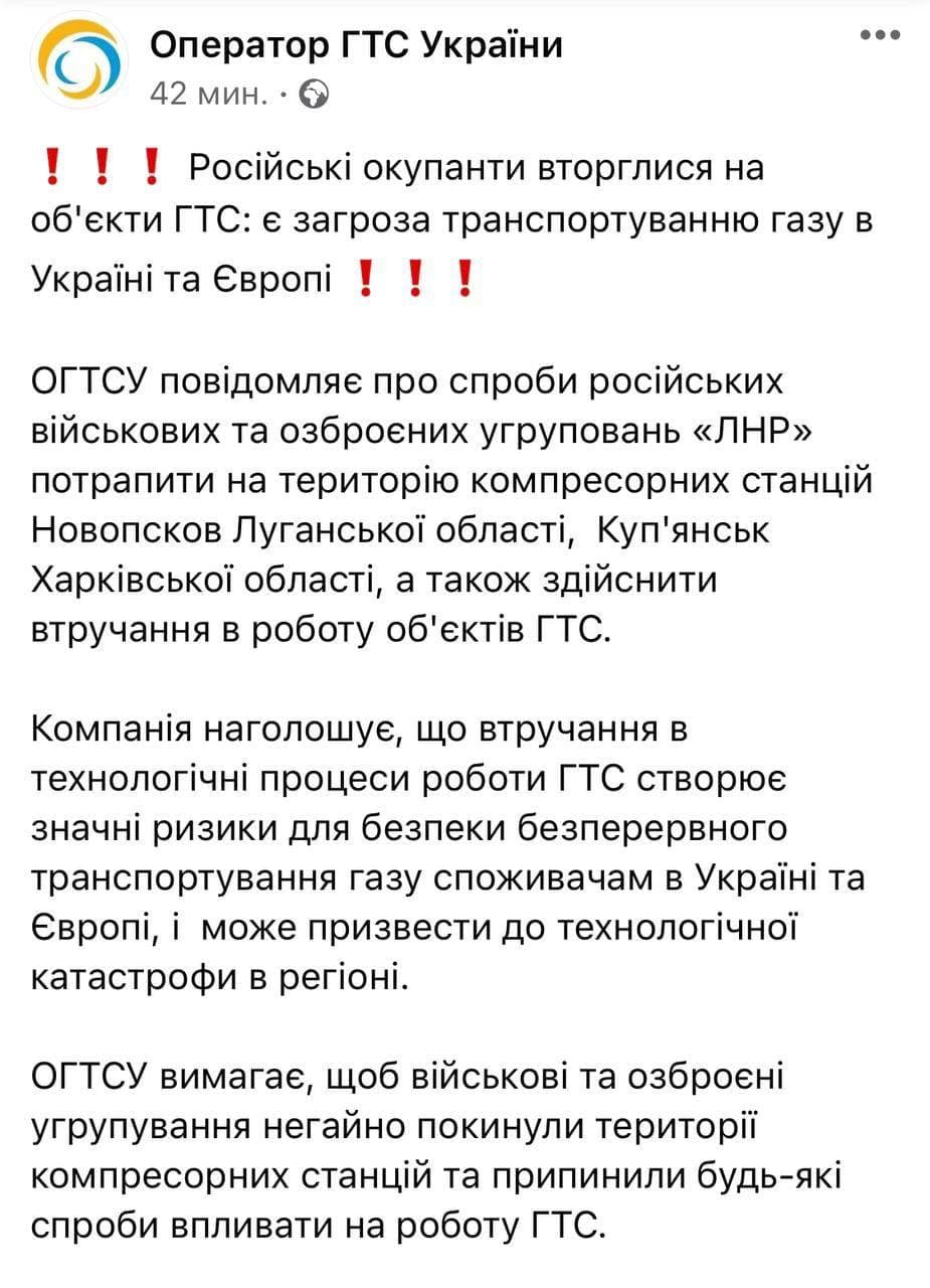 18.58 У Светлодарска (Донецкая область близ линии фронта) в ходе боев перебит газопровод высокого давления.