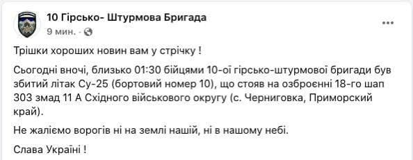 17:17 10 горно-штурмовая бригада заявляет о ещё одном сбитом российском самолёте - Су-25.