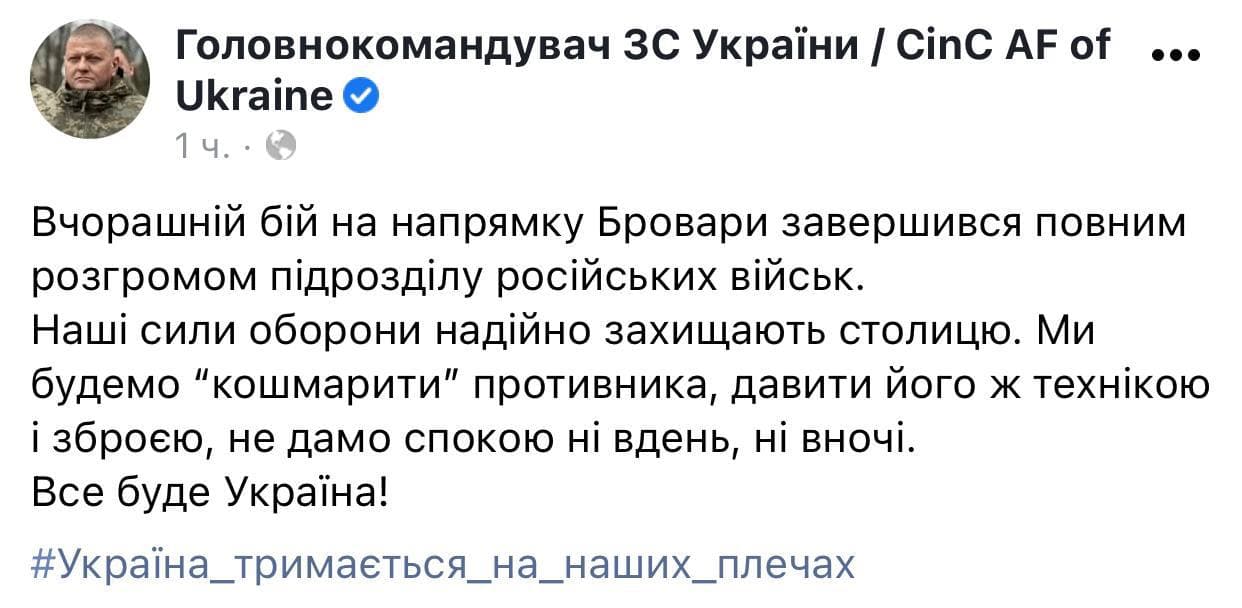 17:35 Главком ВСУ Валерий Залужный сообщил, что бой под Броварами завершился разгромом подразделения противника. Напомним, российские войска наступают на Бровары, чтоб заблокировать Киев с востока.