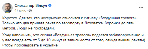 "Только что два прилета ракет по аэропорту в Лозоватке. Воронки до пяти метров. Люди не пострадали", - сообщил Вилкул.