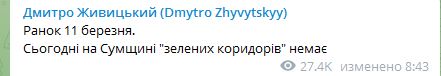 11.30 Губернатор Дмитрий Живицкий о "зеленом коридоре" из Сум - "Переговоры продолжаются. Кто принял решение о выезде - будьте готовы сделать это быстро, в любой день".