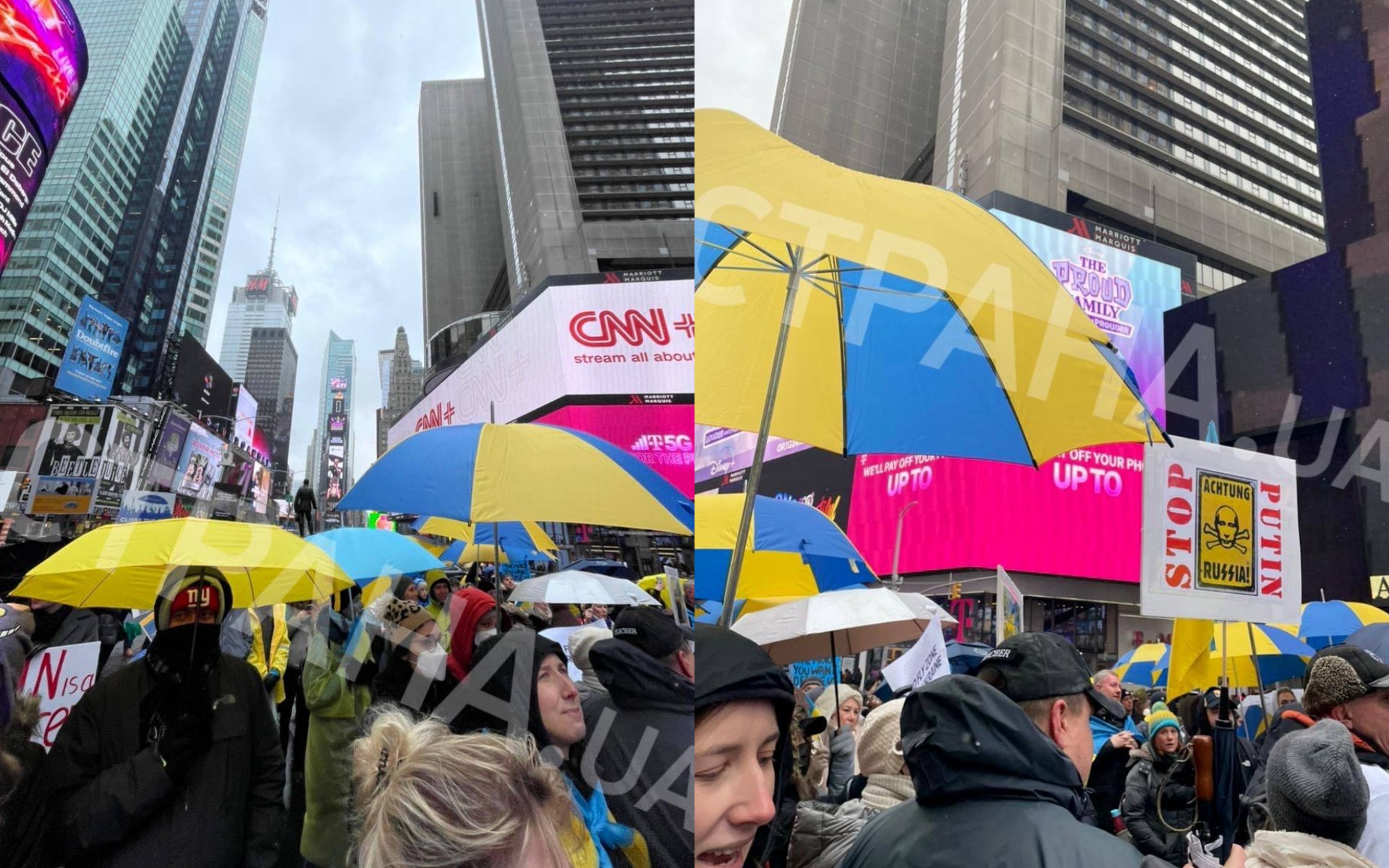 21.06 В Нью-Йорке на главной площади города Таймс Сквер чуть более получаса назад началась акция представителей украинской диаспоры и местного населения с призывом закрыть небо над Украиной. Символ акции - "закрывающие небо" желто-синие зонтики, которые принесли ее участники.
