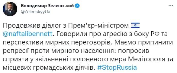 Очевидно, что речь о предложениях израильского премьера Беннета Зеленскому, которые многими расцениваются как призывы к капитуляции Украины. Кроме того, Зеленский попросил помощи в освобождении мэра Мелитополя и местных общественных деятелей.