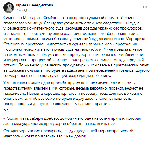 Также Ирина Венедиктова на своей странице в соцсети обратилась к Маргарите Симоньян.