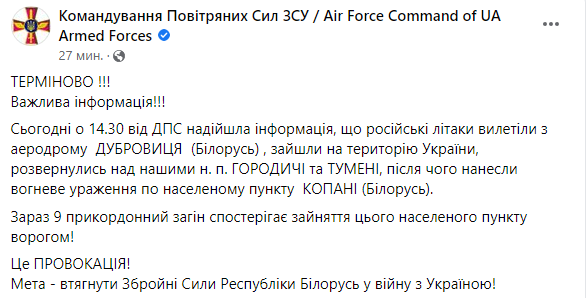 "Сегодня в 14:30 от ДПС поступила информация, что российские самолеты вылетели с аэродрома Дубровица (Беларусь), зашли на территорию Украины, развернулись над нашими н. п. Городичи и Тумены, после чего нанесли огненное поражение по населенному пункту Копани (Беларусь)", - говорится в материале.