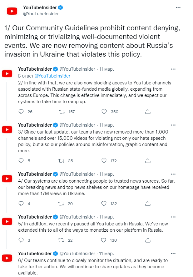 Вместе с тем, YouTube продолжит удалять недостоверный контент о вторжении России в Украину, который "отрицает или преуменьшает четко задокументированные события насилия".