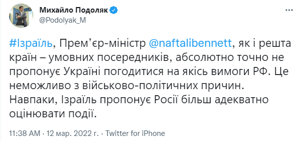 "[Премьер-министр Беннет- ред.] как и остальные страны - условные посредники, совершенно точно не предлагает Украине согласиться на какие-то требования РФ. Это невозможно по военно-политическим причинам. Напротив, Израиль предлагает России более адекватно оценивать события", - написал Подоляк.