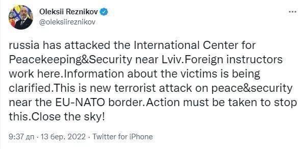 "Россия атаковала Международный центр по поддержанию мира и безопасности под Львовом. Здесь работают иностранные инструкторы... Это новая террористическая атака на мир и безопасность вблизи границы ЕС-НАТО. Нужно принять меры,чтобы остановить это. Закройте небо!" - призвал министр.