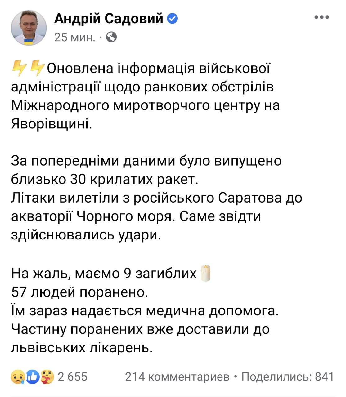 По данным губернатора, ракеты были выпущены с самолетов. В результате обстрела Яворовского военного полигона 9 человек погибли, 57 – ранены, они уже находятся в больнице. Сейчас ГСЧС тушат пожар на месте обстрела.