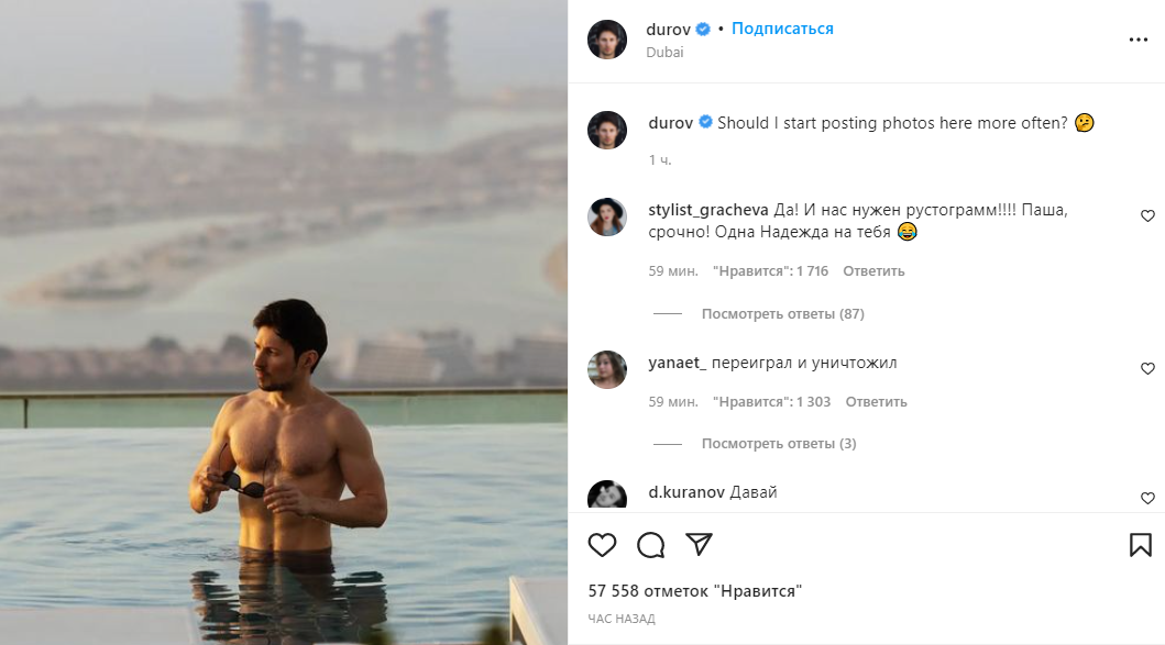Основатель популярного мессенджера Telegram Павел Дуров за пару часов до блокировки "Инстаграма" в России опубликовал на своей странице в этой соцсети свое фото с отдыха в Дубае с вопросом: "Стоит ли мне почаще выкладывать сюда фото?".