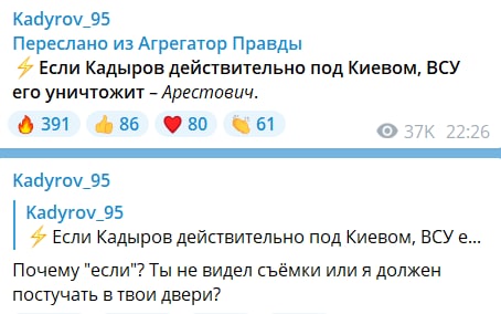 Глава Чечни Рамзан Кадыров на словах подтвердил, что находится сейчас в Украине. Он ответил на заявление советника главы ОП Алексея Арестовича о, том, что если Кадыров действительно находится под Киевом, то его уничтожат.