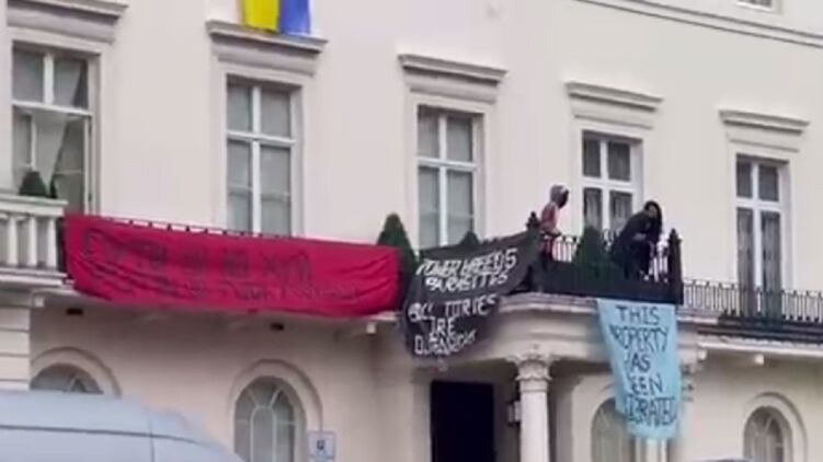 Активисты с украинским флагом "оккупировали" дом российского олигарха Олега Дерипаски в Лондоне.