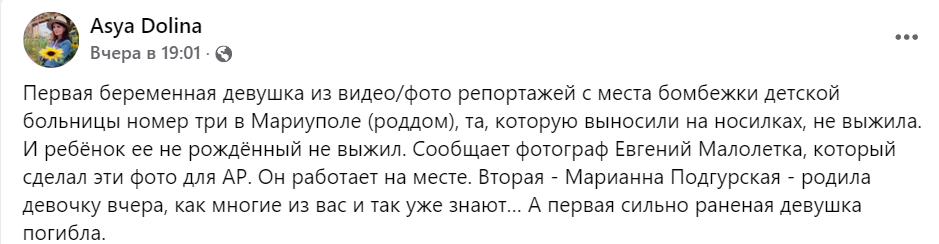 Девушка отметила, что информацию о смерти роженицы подтвердил фотограф Евгений Малолетка, сделавший фото женщин для издания АР.