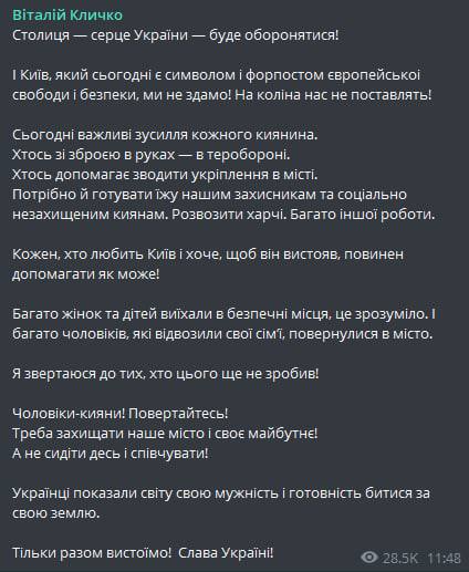 "Мужчины-киевляне! Возвращайтесь! Надо защищать наш город и свое будущее! А не сидеть где-нибудь и сочувствовать!" - призвал Кличко и добавил, что украинцы показали миру свое мужество и готовность сражаться за свою землю.