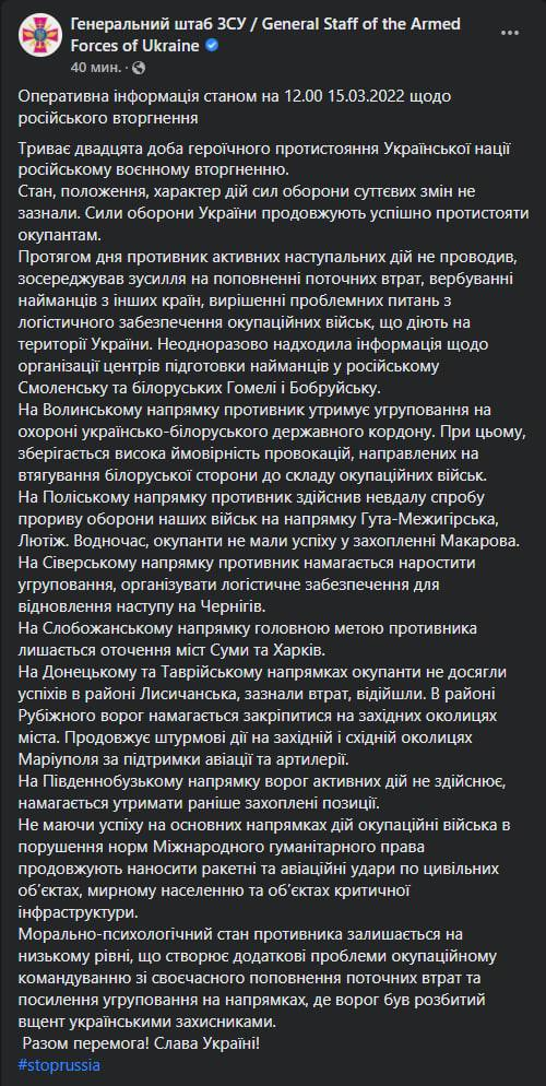 По данным Вооруженных сил Украины, в течение двадцатого дня войны противник не пытался идти в активное наступление, занимаясь восполнением текущих потерь, вербовкой наемников из других стран и решением логистических проблем. На данный момент известно об организации центров подготовки военных в российском Смоленске, а также белорусских Гомеле и Бобруйске.