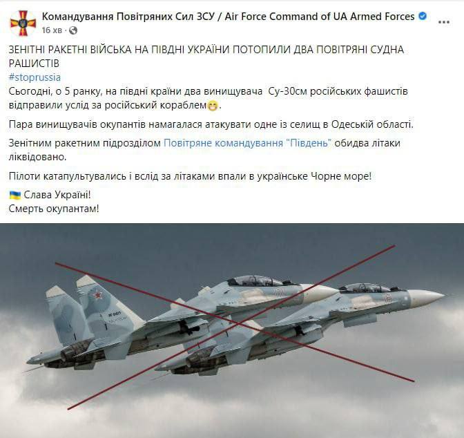 По информации Командования Воздушных Сил ВСУ, самолеты сбили в 05:00. Истребители пытались атаковать один из населенных пунктов Одесской области. Российские пилоты катапультировались и упали в море.