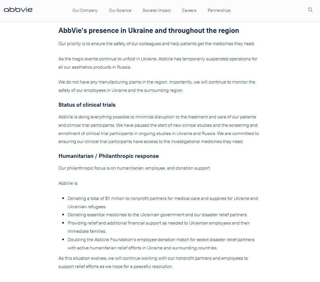 О полной приостановке поставок ботокса, судя по сообщению, речи не идет. Ботулинотерапия применяется также в урологии и неврологии, а AbbVie заявила, что продолжит обеспечение пациентов лекарствами в России.
