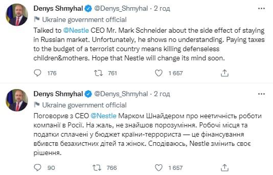 "Поговорил с CEO Nestle Марком Шнайдером о неэтичности работы компании в России. К сожалению, не нашел понимания", - сообщил премьер-министр Украины Денис Шмыгаль.