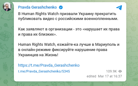 Советник главы МВД Антон Геращенко ответил правозащитной организации Human Rights Watch, которая сегодня призвала Украину прекратить публиковать видео с российскими военнопленными, поскольку это "нарушает их права и права их близких".