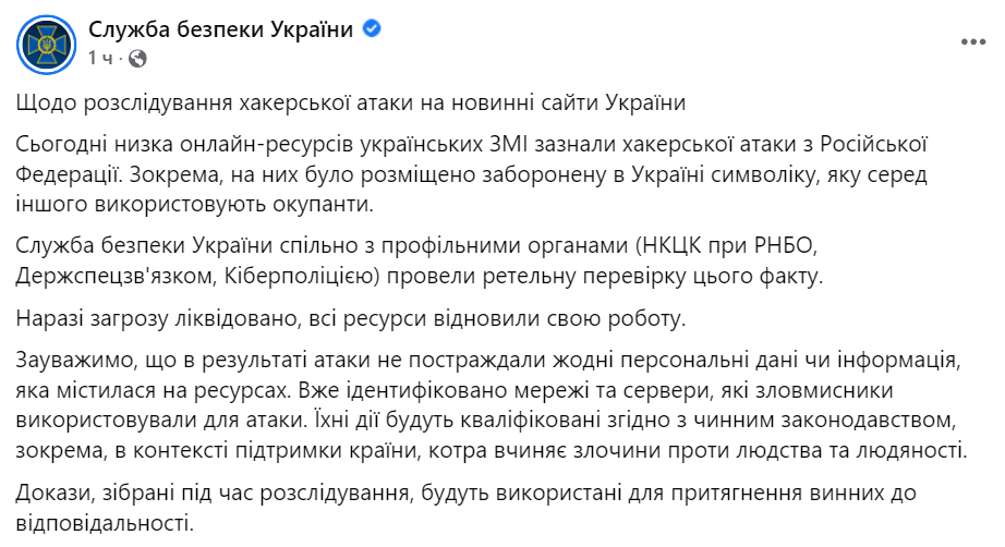 Госспецсвязи и СБУ уже подтвердило, что к атаке причастны российские хакеры, а также добавили, что персональные данные не пострадали, а проблема уже устранена.