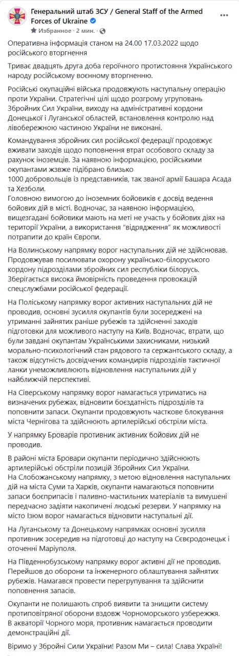 На Полесском направлении враг активных наступательных действий не проводил, основные усилия оккупантов были сосредоточены на удержании занятых ранее рубежей и осуществлении мер подготовки для возможного наступления на Киев. Но из-за больших потерь, низкого морально-психологического духа, а также отсутствия опытных командиров подразделений тактического звена, в ближайшее время наступать они не смогут.