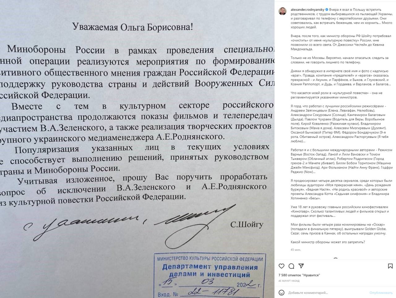 Продюсер Александр Роднянский опубликовал письмо главы Минобороны РФ Сергея Шойгу, в котором тот просит "поручить проработать вопрос об исключении Зеленского и Роднянского из культурной повестки РФ".