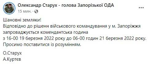 09.20 В Запорожье вводится почти двухдневный комендантский час.