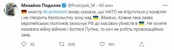 Советник главы ОП Михаил Подоляк отреагировал на слова Ламбрехт у себя в твиттере, назвав ее слова "убийственными".