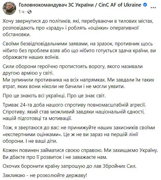 к западу от Киева противник захватил и удерживает рубежи на речке Ирпень. О том, что россиян отбросили на 70 километров от Киева, как это вчера утверждал штаб Сухопутных войск, Генштаб ничего не говорит.