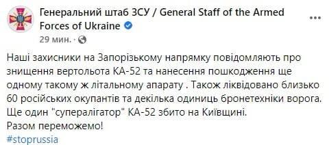 19:19 Генштаб ВСУ сообщил, что на Запорожском направлении уничтожен один российский вертолет КА-52, а второй – подбит.