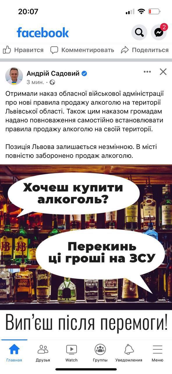 20:18 Мэр Львова Садовой заявил, что в городе продолжится полный запрет на продажу спиртного.