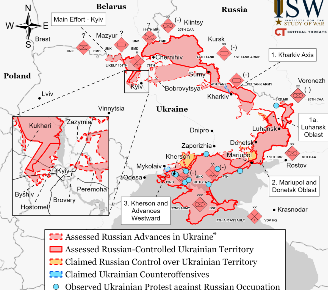 Продолжаются жестокие бои в Мариуполе и захват населенных пунктов на Донбассе. В остальных регионах активного наступления пока не проводится, но идут бои местного значения.
