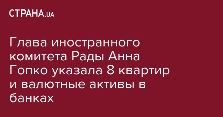 Глава комитета Верховной Рады по иностранным делам Анна Гопко указала в электронной декларации за 2015 год 8 квартир в Киеве и Львове, которыми владеет она и ее супруг Александр Жук. Ее доход главы в 2015 году составил 187,7 тысяч грн.