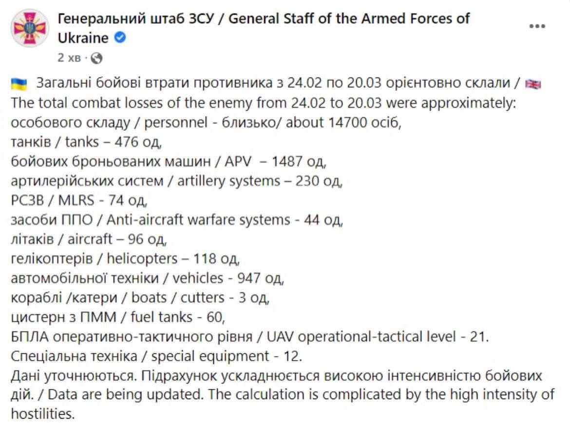 Ориентировочные потери личного состава российских войск по состоянию на 20 марта достигли 14 700 солдат.