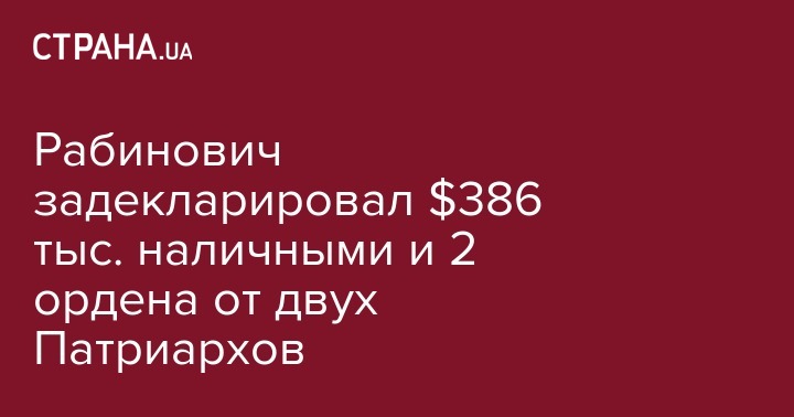 Депутат Верховной Рады от фракции "Оппозиционный блок", секретарь парламентского комитета по вопросам прав человека Вадим Рабинович задекларировал $386 тыс. наличных средств, а также 2 ордена Украинской православной церкви Киевского патриархата и УПЦ Московского патриархата в 2015 году.